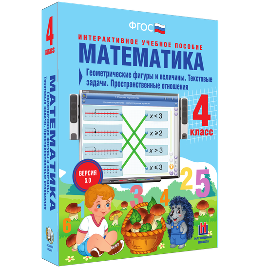 Пособие можно использовать с любыми учебниками, входящими в Федеральный перечень. Интерактивное учебное пособие «Математика 4 класс. Геометрические фигуры и величины. Текстовые задачи. Пространственные отношения» содержит все темы годового учебного курса по математике. В каждую тему включены тестовые контрольные задания, интерактивные упражнения на усвоение теоретического материала и на отработку практических навыков. В пособии использованы следующие медиоабъекты: анимации, аудиосопровождение заданий, интерактивные схемы, работа с виртуальными инструментами, 3-D модели, установление соответствия (соединение), последовательности, обобщение, классификация объектов, кроссворды, интерактивные таблица умножения.