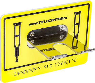 Универсальныйный травмобезопасный крючок предназначен для крепления одновременно 2х костылей или трости. Для слабовидящих — держатель трости контрастно выделяется в интерьере яркой пиктограммой, а для тотально незрячих дополнительно нанесены рельефные надписи с применением системы Брайля.