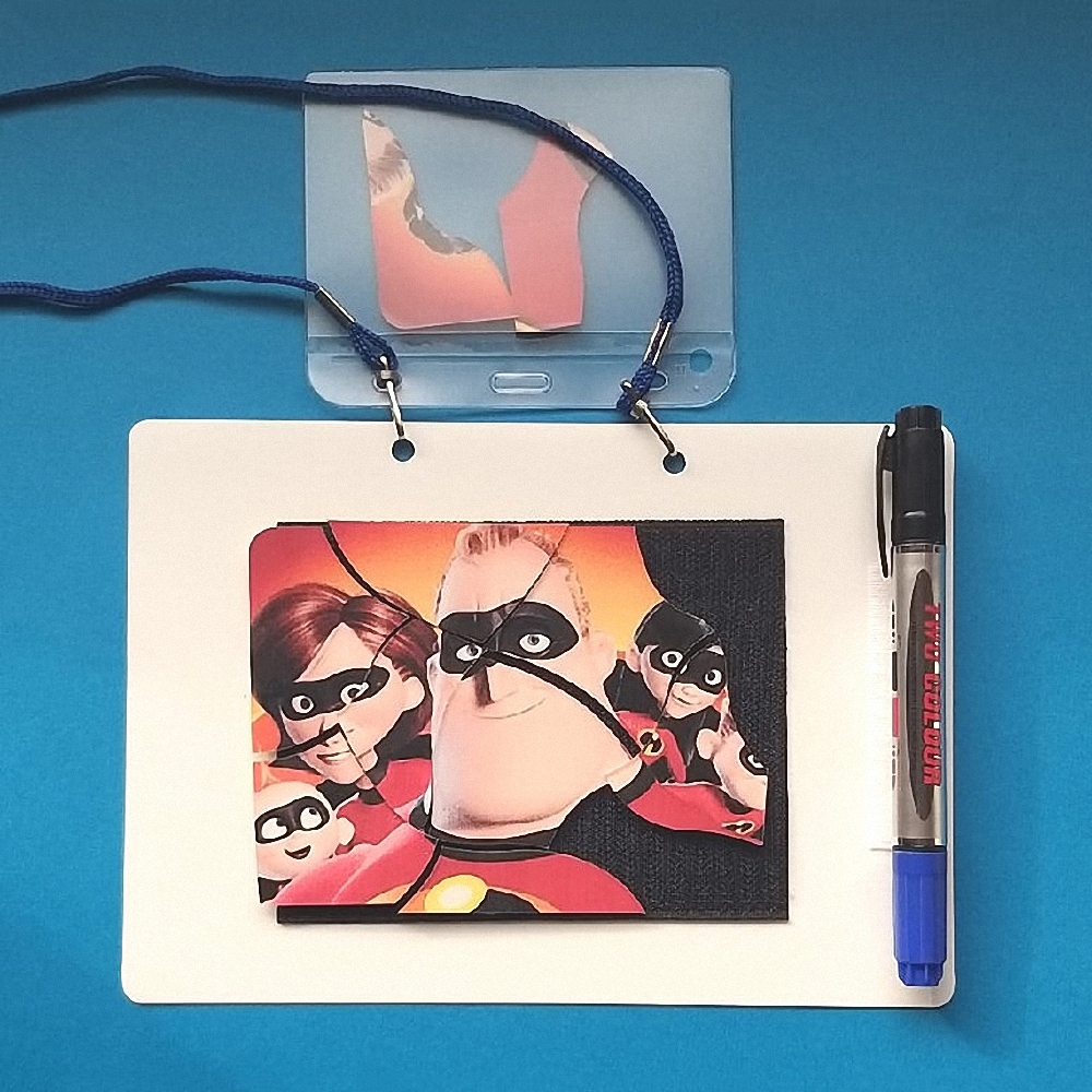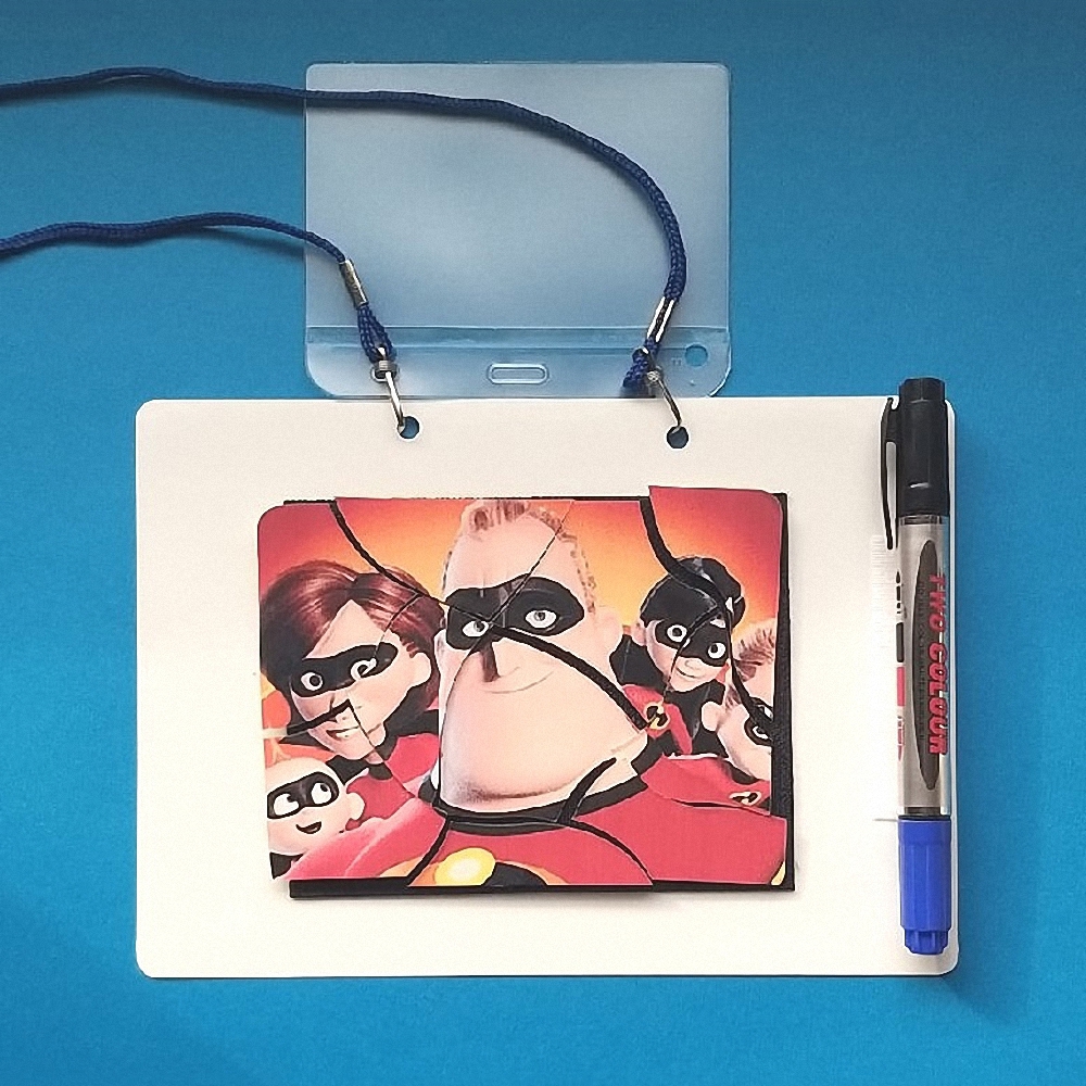 Планшет можно держать всегда под рукой. Благодаря шнуру, его можно носить на шее. Для хранения пазла есть карман. К планшету крепится маркер для белой доски и небольшой отрез фетра, чтобы стирать написанное.