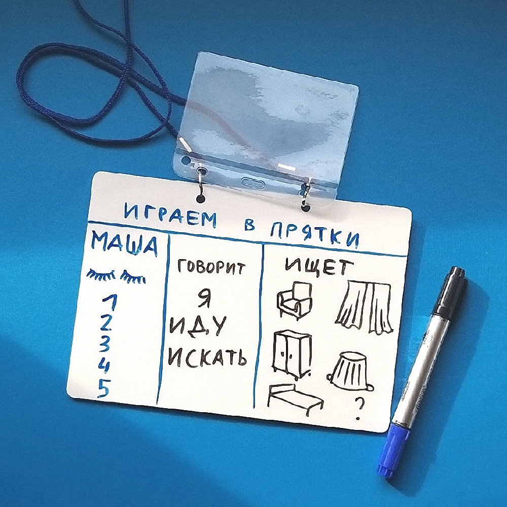 Визуальная поддержка часто используется для того, чтобы донести информацию до ребенка с особенностями. Детям проще увидеть, чем услышать. Поэтому с обратной стороны планшета располагается маркер для белой доски и свободное пространство, на котором можно писать или рисовать.