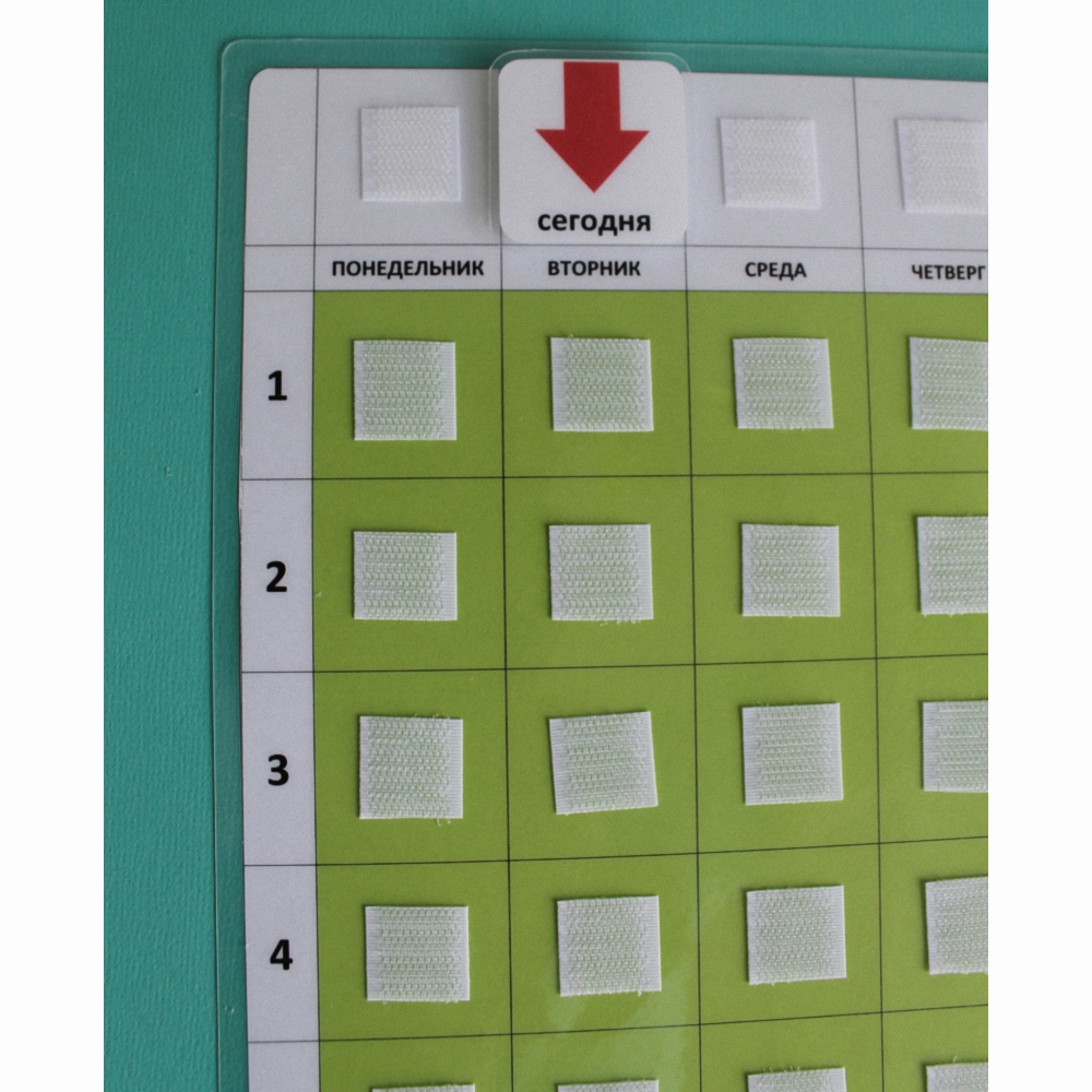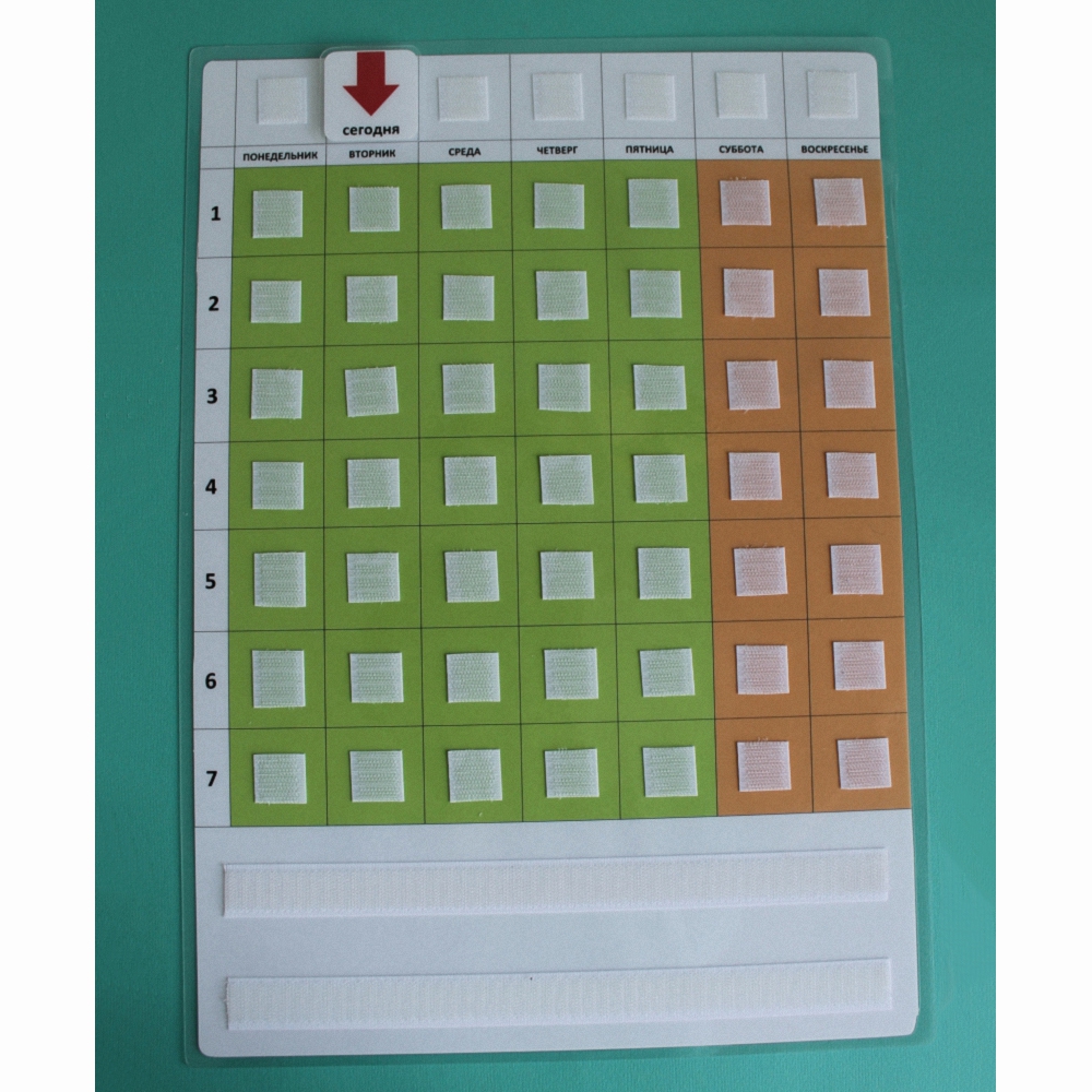 Расписание на неделю поможет дошкольникам и младшим школьникам ориентироваться в делах, которые запланированы на неделю. В верхней строке есть индикатор "сегодня". Две нижние строки служат для хранения не используемых на данный момент карточек. В столбце выстраиваются карточки предстоящих дел.