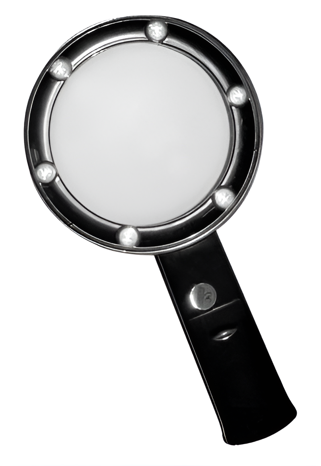 Лупа ручная круглая 5-кратная, диаметр 75 мм, со светодиодной подсветкой. Шесть ярких светодиодов, расположенных вокруг линзы, освещают объекты или читаемый текст. Незаменима для тех, кому нужно разглядеть мелкие детали изображения или текста.