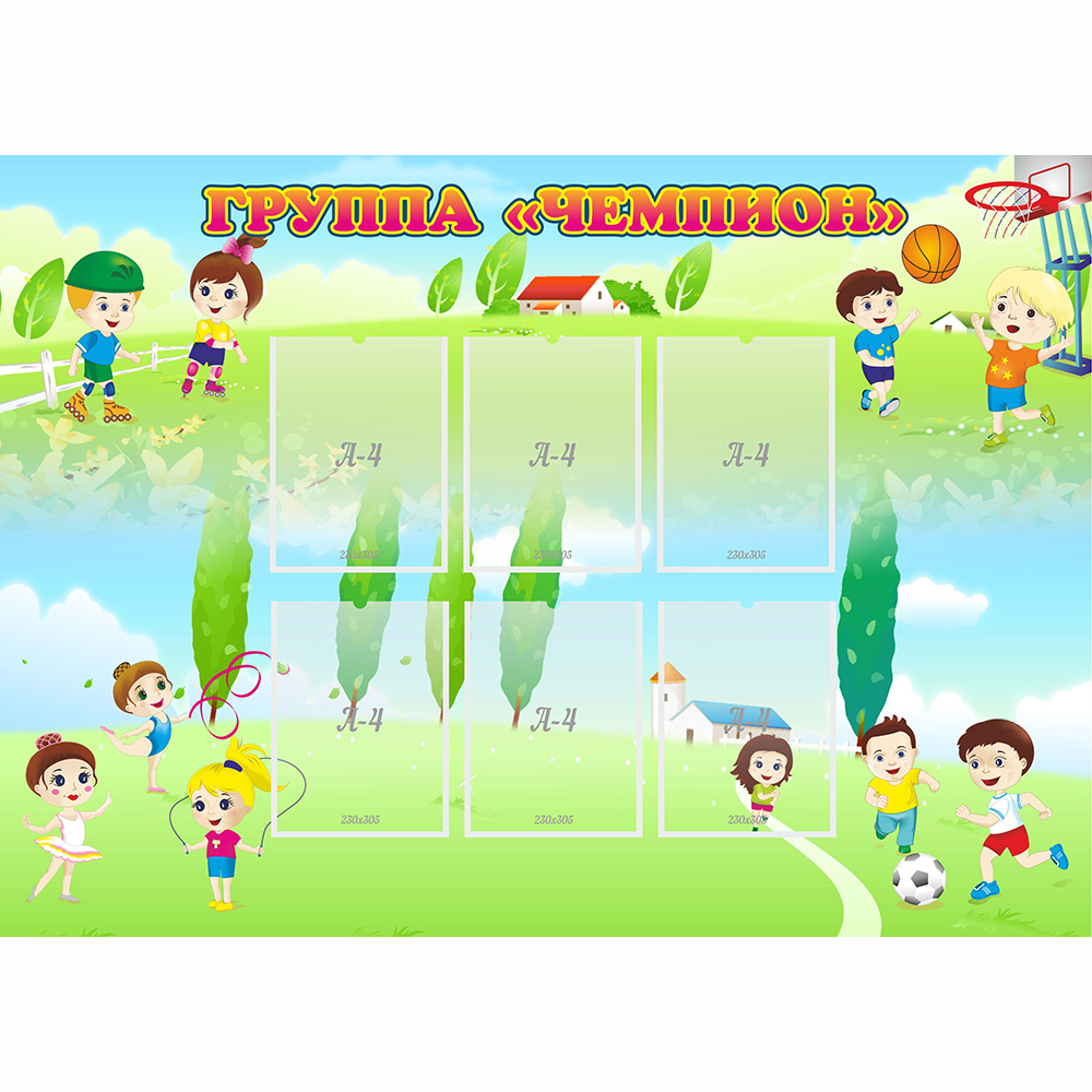 Стенд отлично подойдет для группы активных мальчишек и девчонок. Название выполнено заглавными буквами, размещено в одну строку вверху стенда. Стенд имеет два тематических сюжета: девочки, прыгающие через скакалку и мальчишки, играющие в футбол и баскетбол.