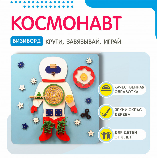 • Фантазия и воображение: форма космонавта и разнообразные игровые элементы на бизиборде стимулируют фантазию и воображение детей, позволяя им создавать свои собственные игровые сценарии и истории.