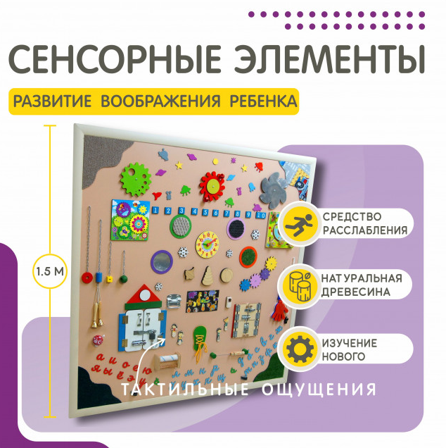 Бизиборд выполнен из качественной древесины и имеет долговечную конструкцию. В комплекте к нему входят все необходимые крепления, что обеспечивает безопасность ребенка при использовании.
