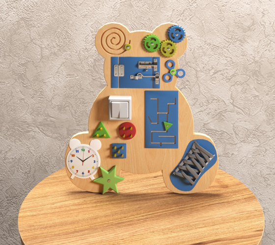 Бизиборд в виде медвежонка разнообразит времяпрепровождение ребенка в детской комнате, в кабинетах логопеда и психолога, а также детских учреждениях. С этой игрой ребенок может менять правила игры, развивая в себе самые лучшие качества.