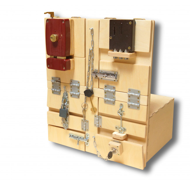 - Разнообразные задвижки, замочки, замки и защелки развивают мелкую моторику, логику и координацию движений у ребенка.