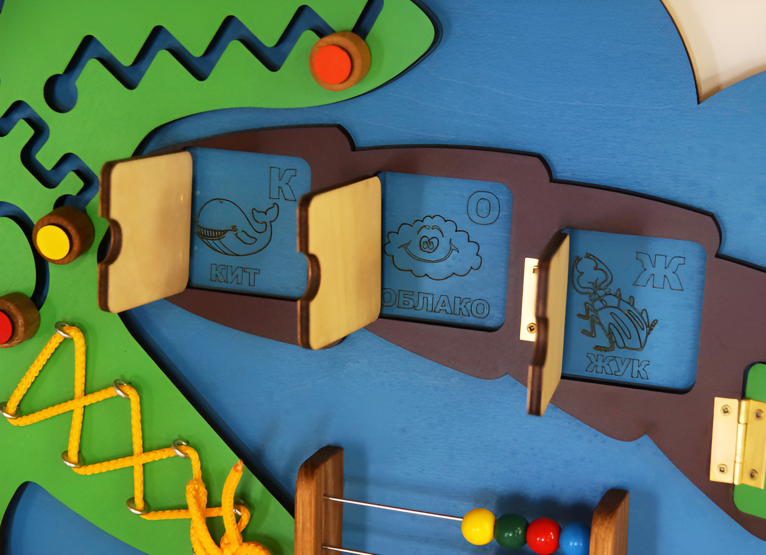 Математическая панель со съёмными фигурами познакомит с системой исчисления и научит размещать числа в верном порядке. Крутя шестерёнки, ребёнок сможет успокоиться и отвлечься от динамичной игры. Передвигая элементы по тактильному лабиринту и играя с ползунком, малыш развивает мелкую моторику пальцев, а завязывая и развязывая шнуровку, открывая и закрывая дверные запоры – приобретёт необходимые полезные навыки.