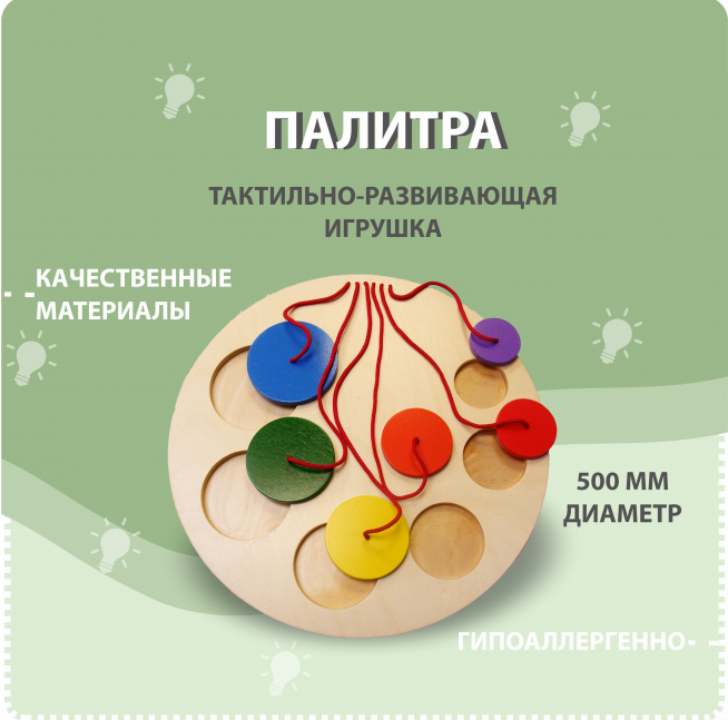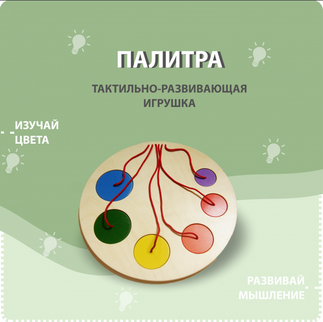 Тактильно-развивающая игрушка в виде палитры - это увлекательная и познавательная игра, выполненное из качественных материалов, не оставляет зацепок в детских ручках. Большой круг с цветными кружочками разного размера поможет ребенку познакомится с формами разных размеров. Игра поможет расслабиться ребенку и переключиться с активных игр. Каждый круг можно достать из панели и вставить обратно, потому что он прикреплен нитками. Панель заинтересует как маленьких детей, так и постарше, а родителям поможет сохранить дом в целости и сохранности. Она подойдет для домашнего использования и для специальных учреждений.