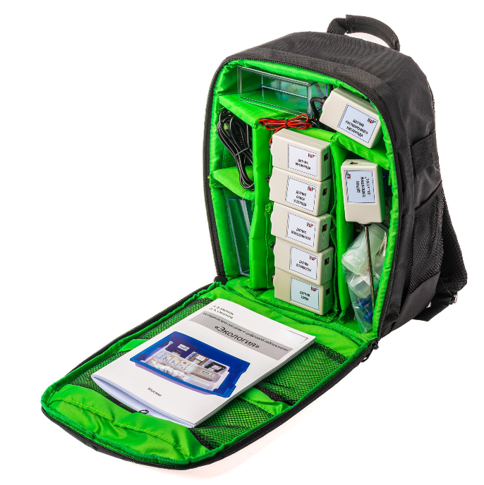 Все элементы внутри рюкзака располагаются в мягких отсеках для исключения повреждения элементов цифровой лаборатории в результате ударов, встряски.