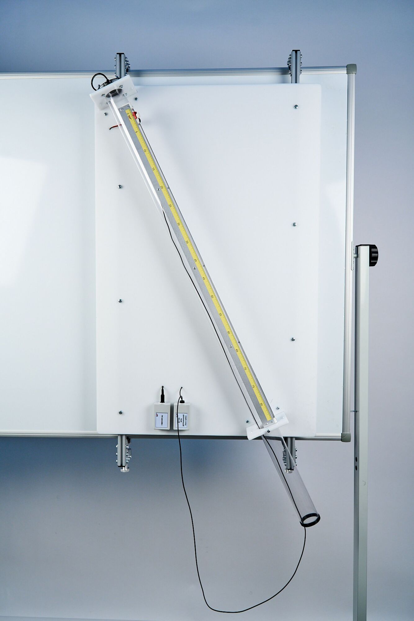 На каркасе из металлических труб установлена звуковая труба, в которой реализуется распространение звуковой волны и обеспечивается измерение скорости звука двумя методами. Контроль параметров звуковой волны в двух точках пространства осуществляется с помощью двухканального датчика звука, имеющего два микрофона. Конструкция установки позволяет перемещать одиниз микрофонов вдоль трубы и определять его координату по специальной шкале. Источником звука служит динамик, который под ключается к USB-порту компьютера и управляется с помощью программного обеспечения.