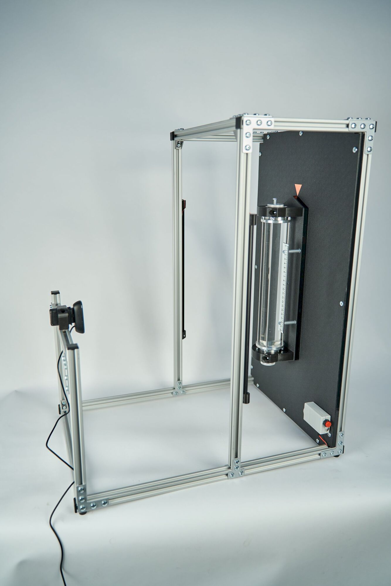 Лабораторная установка представляет собой вертикальный металлический стенд с цилиндром, заполненным жидкостью. Регистрация движения шарика в жидкости осуществляется с помощью веб-камеры, подключаемой к компьютеру. Веб-камера установлена на специальном кронштейне достаточной жесткости. Равномерное освещение цилиндра осуществляется с помощью устройства подсветки.