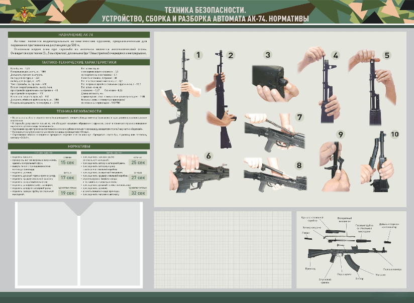 Стенд-уголок маркерный "Техника безопасности. Устройство, сборка и разборка автомата АК-74. Нормативы"