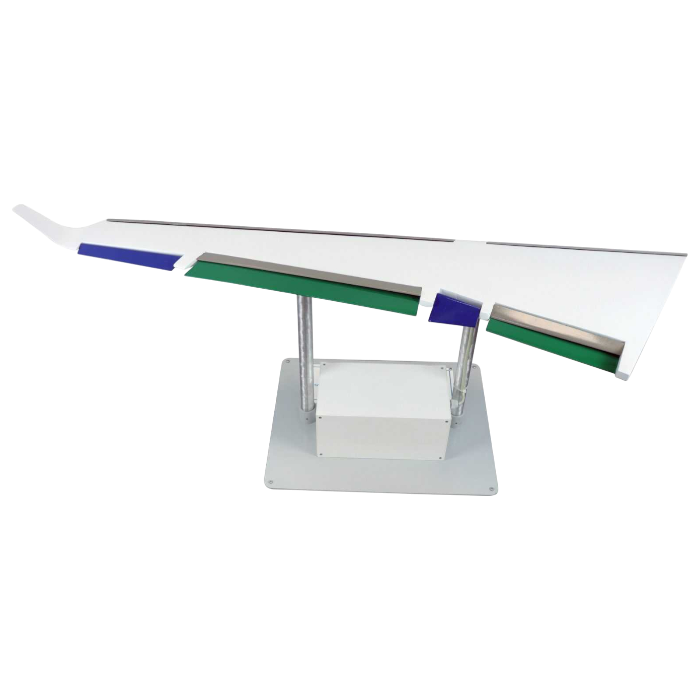 Учебный макет представляет собой масштабную копию консоли крыла пассажирского самолета ИЛ - 96, с отклоняемыми элементами механизации и управления (предкрылки, закрылки, элероны, интерцепторы и т.д.), все элементы имеют цветовую дифференциацию и позволяют легко их идентифицировать.