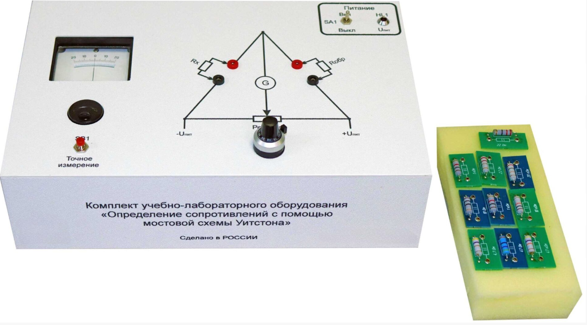 Комплект учебно-лабораторного оборудования предназначен для проведения лабораторно-практических занятий по курсам: "Физика. Электричество и магнетизм", "Теория электрических цепей", "Радиотехнические цепи и сигналы" с целью определения сопротивлений с помощью мостовой схемы Уитстона.