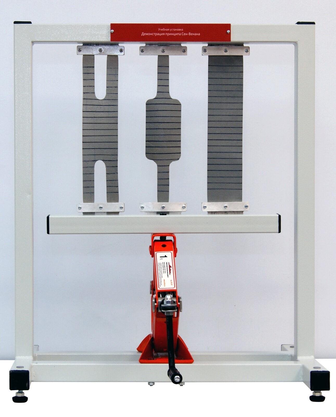 Лабораторная установка «Демонстрация принципа Сен-Венана» предназначена для проведения лабораторно- практических занятий дисциплин «Техническая механика», «Прикладная механика», «Сопротивление материалов» и других смежных технических дисциплин. Стенд позволяет исследовать принцип Сен-Венана на примере обратимой деформации пластичных образцов различного профиля. Лабораторная установка позволяет организовать рабочее место для бригады студентов из 2-3 человек.