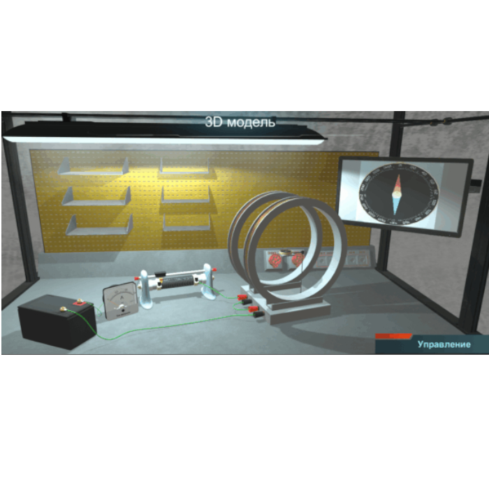 Практикум позволяет в трехмерной среде изучать воздействие магнитного поля колец Гельмгольца на стрелку компаса в среде магнитного поля Земли, путем визуализации магнитных силовых линий.